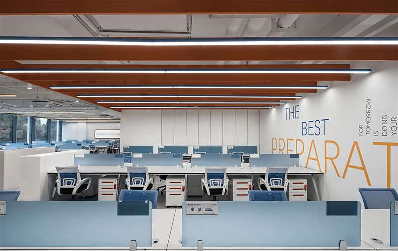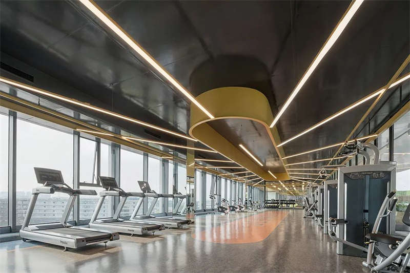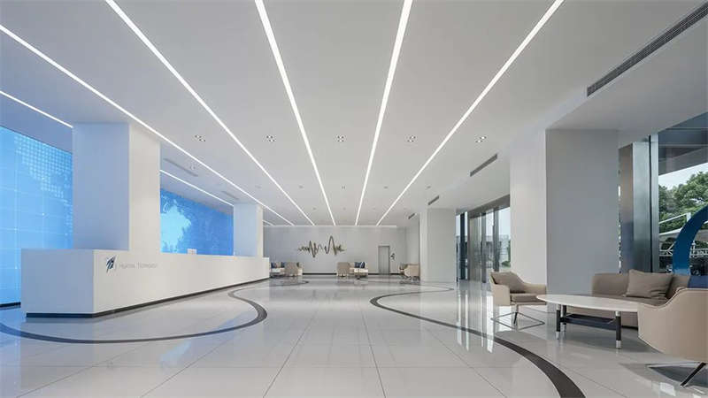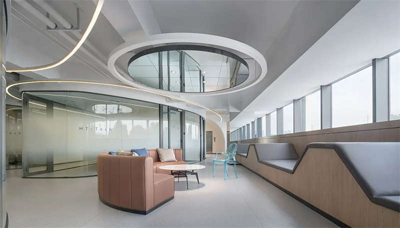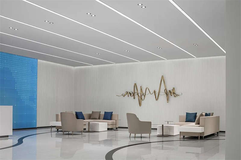 前廳頂部,鏡面質(zhì)感與光帶反射,使空間得到延伸、重疊呼應(yīng),營造出多維的視覺效果,同時打破科技辦公室設(shè)計的刻板印象,擁有寬敞開放的前臺設(shè)計、待客區(qū),層次、質(zhì)感、豐滿而厚重。