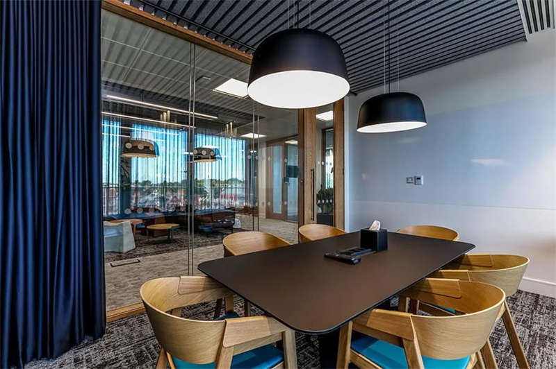 照明方案采用了多種光照的組合形式,以創(chuàng)建自然日光的感覺。對(duì)于技術(shù)部門來說,重要的是照明不能太高科技感或像一個(gè)大燈箱,因此這里使用了軌道照明代替漫射器和聚光燈。會(huì)議室以吊燈為主,突出與會(huì)人員的面部照明,以及屏幕上方用于遠(yuǎn)程通話的燈光,因此,需要更專業(yè)的照明設(shè)計(jì),以清晰、明亮的映襯和傳遞人物形象。