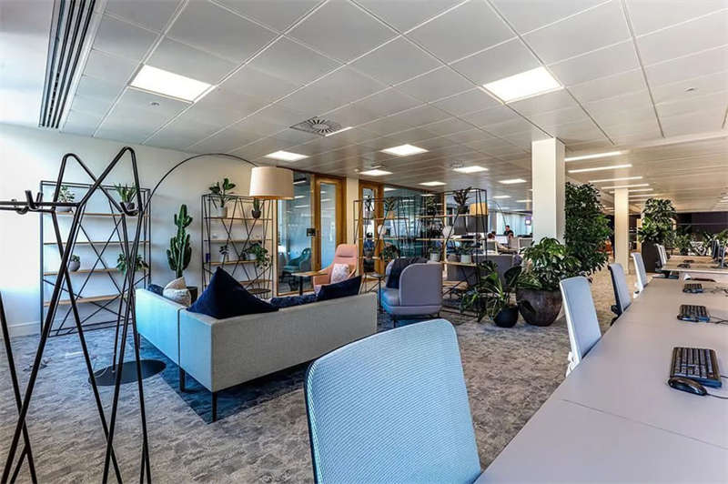 此番改造的一個(gè)重要主因是給到員工愿意回歸辦公室的理由。這意味著提升整體設(shè)施的實(shí)用性和美觀性,同時(shí)增加協(xié)作空間并整合遠(yuǎn)程工作人員的需求。因此對(duì)當(dāng)代前沿科技的投資成為關(guān)鍵要素。為了支持混合工作模式,設(shè)計(jì)公司在早期就任命了一名AV專家,以便可以通過應(yīng)用程序或基于桌面的預(yù)訂系統(tǒng)預(yù)訂工作空間。同時(shí),傳統(tǒng)工作站與可替代工作設(shè)施之間的界限也進(jìn)一步擴(kuò)大,平均(NIA室內(nèi)凈面積)比率為1:10。此外,之前辦公桌與員工1:1的比例也被新的1:1.6比例所取代。