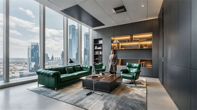 色彩體系以冷灰為主基調,局部運用墨綠、深藍跳色,通過絨面、金屬、玻璃不同材質的反射與漫射形成豐富層次??臻g規(guī)劃注重功能性延展,會議室配置可移動隔斷系統(tǒng),實現 4 種空間組合形態(tài)。員工休憩區(qū)創(chuàng)新采用垂直綠植墻結合智能新風,PM2.5 實時監(jiān)測顯示系統(tǒng)保障健康環(huán)境。