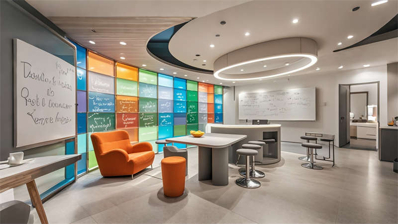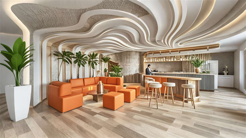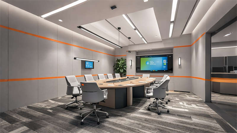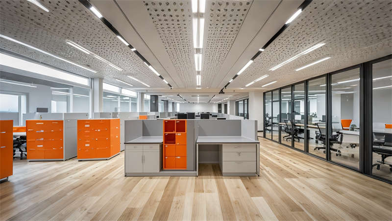 本項(xiàng)目為1800㎡現(xiàn)代簡約風(fēng)格辦公室整體設(shè)計(jì),以 ' 高效?活力?互聯(lián) ' 為核心設(shè)計(jì)理念??臻g規(guī)劃采用動(dòng)靜分區(qū)原則,前廳通過淺灰大理石與橙色 logo 的碰撞凸顯企業(yè)形象,開放辦公區(qū)運(yùn)用玻璃隔斷保證采光與交流效率。色彩體系以企業(yè)標(biāo)準(zhǔn)色淺灰為主調(diào),搭配活力橙點(diǎn)綴,木色中和冷峻感。材質(zhì)選用環(huán)保型穿孔鋁板、防滑地磚和 E0 級(jí)板材,集成智能會(huì)議系統(tǒng)和隱藏式線管設(shè)計(jì)。重點(diǎn)空間如高管辦公室采用深胡桃木提升質(zhì)感,休息區(qū)通過波浪吊頂和模塊沙發(fā)營造輕松氛圍。照明系統(tǒng)采用 4000K 色溫 LED 線型燈帶,搭配局部裝飾吊燈,確保工作照度與空間美感平衡。全案貫徹人體工學(xué)設(shè)計(jì),預(yù)留 20% 彈性空間適應(yīng)未來發(fā)展需求。