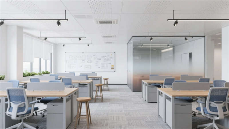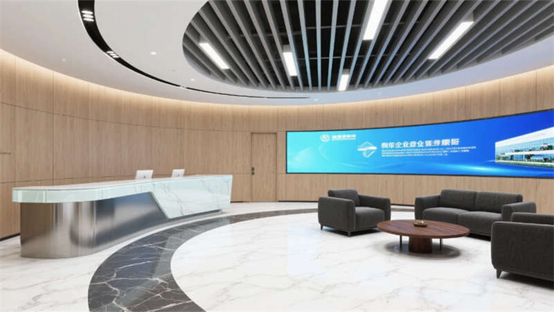 企業(yè)大堂延續(xù)外立面色系,雪花白大理石地面與深灰導視帶構(gòu)建空間骨架,曲面木紋石背景墻通過背光企業(yè)標識形成視覺焦點,漸變鋁方通吊頂?shù)木€性光帶引導人流走向。開放式辦公區(qū)以灰橡木辦公模塊為核心,沖孔鋁板吊頂整合軌道射燈系統(tǒng),漸變霧化玻璃隔斷內(nèi)置綠植槽,編織紋地毯有效降低行走噪音。