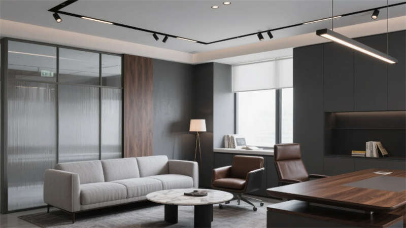 高管辦公區(qū)通過灰玻與豎向木紋鋁材構(gòu)筑半私密空間,L型胡桃木辦公桌與深棕真皮座椅彰顯商務質(zhì)感,獨立閱讀角的落地燈營造人文氛圍??偛棉k公室運用懸浮式書架墻與黑檀木辦公桌塑造權(quán)威感,環(huán)形皮革沙發(fā)組與天然大理石茶幾構(gòu)成高端會客場景,日式茶室通過木格柵與洞石墻面實現(xiàn)東西方美學交融。