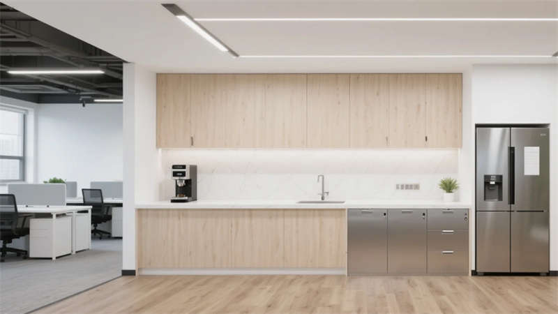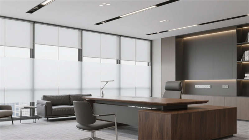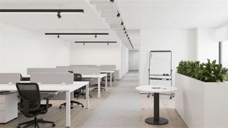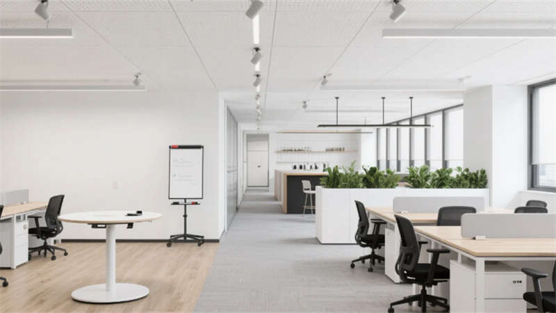 室內(nèi)空間延續(xù)外立面設(shè)計(jì)語(yǔ)言,企業(yè)大堂通過(guò)技術(shù)創(chuàng)新實(shí)現(xiàn)淺白大理石與木紋墻面的無(wú)縫拼接,懸浮式線性燈光系統(tǒng)可隨自然光線智能調(diào)節(jié)色溫。開(kāi)放式辦公區(qū)配置智慧化模塊組合,可升降桌體與軌道射燈靈活適配多元場(chǎng)景,協(xié)作島集成無(wú)線充電與環(huán)境感知功能。高管辦公室采用智能霧化玻璃隔斷,實(shí)現(xiàn)隱私與通透的自由切換??萍紩?huì)議室搭載高清透明顯示系統(tǒng)與多聲道聲學(xué)設(shè)備,電動(dòng)百葉簾與補(bǔ)光系統(tǒng)聯(lián)動(dòng)打造智能會(huì)議環(huán)境。