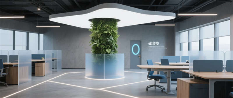 本項目以“未來生態(tài)辦公”為核心理念,打造1200㎡科技與自然交融的創(chuàng)新型辦公空間。設(shè)計采用啞光太空灰為主基調(diào),通過霧霾藍企業(yè)色與原木紋理的碰撞,在冷峻科技感中注入人文溫度??臻g以微水泥地面為基底,貫穿透光亞克力與陽極氧化鋁材質(zhì),配合隱藏式線性燈帶的流動光影,構(gòu)建出具有呼吸感的數(shù)字美學(xué)場域。