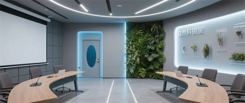 各區(qū)域通過四大統(tǒng)一性語言緊密串聯(lián):霧霾藍橢圓金屬門把手貫穿全空間,再生材料家具呼應(yīng)可持續(xù)發(fā)展理念,聲學(xué)墻面嵌入本地植物標(biāo)本強化生態(tài)屬性,智能燈光系統(tǒng)則通過4000K色溫線性燈帶實現(xiàn)晝夜場景的無縫切換。特別設(shè)計的全息投影展廳與智能階梯會議室,通過LED交互地屏與AR懸浮展臺,將品牌科技基因融入空間體驗。