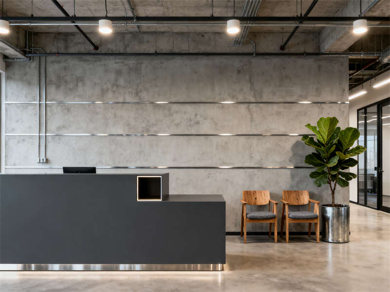 室內(nèi)空間延續(xù)整體風(fēng)格,以深灰、淺灰與原木色為主色,搭配金屬元素點(diǎn)綴,材質(zhì)上運(yùn)用水泥漆、裸露管線(簡(jiǎn)化處理)、實(shí)木與玻璃,構(gòu)建出連貫的視覺體驗(yàn)。前臺(tái)接待區(qū)用深灰色前臺(tái)與水泥漆背景墻奠定基調(diào),等候區(qū)的原木色座椅緩解工業(yè)風(fēng)的冷硬;開放辦公區(qū)以規(guī)整的桌椅布局保障高效辦公,共享工作臺(tái)與綠植隔斷提升空間活力。?