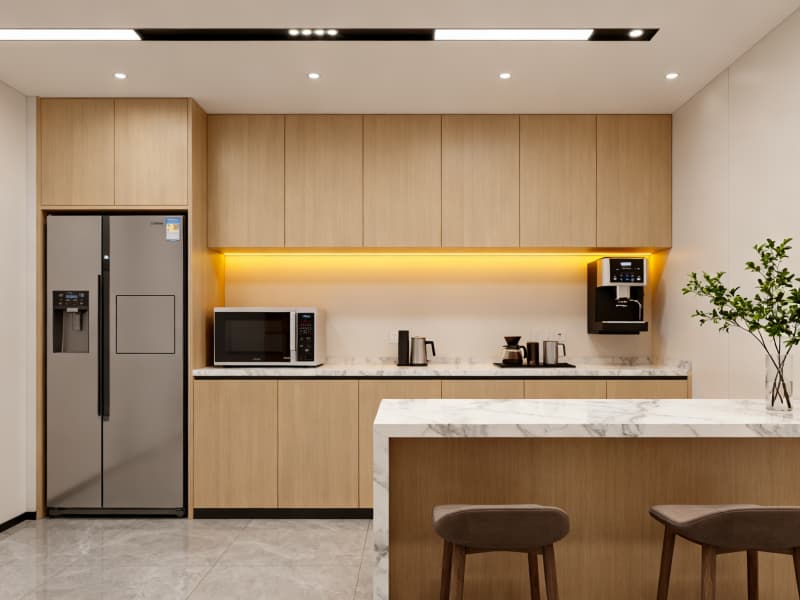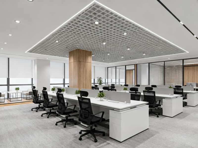 空間布局上,科學(xué)劃分接待區(qū)、開放辦公區(qū)、獨(dú)立辦公室、會議室、茶水間等功能區(qū)域,優(yōu)化動線設(shè)計,保證辦公流程順暢。開放辦公區(qū)注重靈活性與協(xié)作性,模塊化家具與可移動隔斷適配不同工作場景;獨(dú)立辦公室與會議室強(qiáng)調(diào)私密性與專業(yè)性,通過材質(zhì)與燈光營造專注氛圍;休閑茶水間與休息區(qū)則注重放松感,自然元素的融入緩解工作壓力,平衡工作與休息。