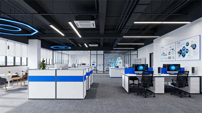 室內(nèi)空間設(shè)計(jì)以 “高效便捷” 為核心,各功能區(qū)域劃分清晰且銜接流暢。生產(chǎn)區(qū)域注重動(dòng)線規(guī)劃,確保設(shè)備擺放與人員操作互不干擾,地面選用耐磨易清潔的材質(zhì),墻面以淺色調(diào)為主,增強(qiáng)空間明亮度,減少視覺(jué)疲勞;倉(cāng)儲(chǔ)區(qū)域通過(guò)分層貨架與合理照明設(shè)計(jì),提升儲(chǔ)物效率與取用便利性;辦公區(qū)域融入簡(jiǎn)約辦公家具,搭配柔和燈光,營(yíng)造舒適的工作氛圍;質(zhì)檢區(qū)域則強(qiáng)調(diào)視野開(kāi)闊,便于工作人員精準(zhǔn)操作;休息區(qū)域注重溫馨感,為員工提供放松空間;配電與設(shè)備機(jī)房采用規(guī)整的管線排布與防護(hù)設(shè)計(jì),兼顧安全性與維護(hù)便捷性;通道區(qū)域通過(guò)清晰標(biāo)識(shí)與防滑處理,保障人員通行安全。整體設(shè)計(jì)從生產(chǎn)、辦公、休憩等多維度出發(fā),讓廠房既滿足工業(yè)生產(chǎn)的實(shí)用需求,又具備舒適有序的空間體驗(yàn)。