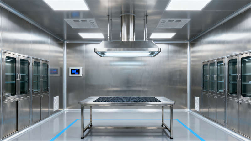 室內空間圍繞醫(yī)療器械生產需求展開,各區(qū)域設計既適配功能,又保持視覺統(tǒng)一。無菌組裝區(qū)域選用無縫潔凈材質,避免積塵殘留,保障生產環(huán)境;精密檢測區(qū)側重隔音與光線控制,為檢測工作營造低干擾氛圍;原料倉儲區(qū)以規(guī)整的貨架布局,適配物料存放需求;研發(fā)實驗室設置島式實驗臺與通風柜,兼顧實驗操作與中試功能;潔凈走廊通過指引設計明確人流物流方向,確保流程有序;無菌更衣區(qū)按潔凈流程分區(qū),實現(xiàn)人員潔凈過渡;中控室以核心監(jiān)控設備為中心,方便實時掌握廠房運行狀態(tài)。