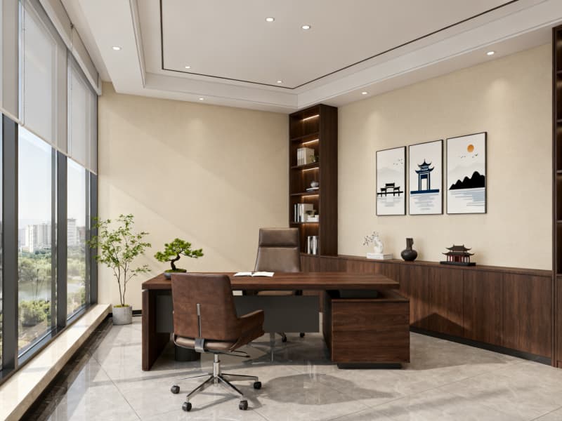 本設(shè)計(jì)以滿(mǎn)足辦公功能需求為核心,融合現(xiàn)代簡(jiǎn)約風(fēng)格與蚌埠地域文化元素,打造兼具實(shí)用性與美觀性的辦公空間。整體空間色彩以淺色系為主,搭配深色點(diǎn)綴,營(yíng)造清爽、舒適的視覺(jué)效果,同時(shí)通過(guò)落地玻璃窗、線性吊燈等設(shè)計(jì)引入充足光線,減少空間壓抑感。?