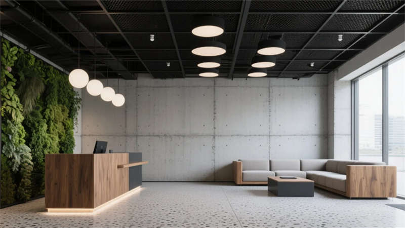 步入大堂,粗獷的混凝土墻面與水磨石地面形成質(zhì)感對(duì)話,懸浮金屬網(wǎng)天花下,原木前臺(tái)與背光綠植墻暈染出溫潤(rùn)生命力。開放式辦公區(qū)延續(xù)工業(yè)基調(diào),模塊化橡木桌搭配黑色鋼架,綠植隔斷巧妙劃分空間,自然光穿過智能遮陽(yáng)簾,在混凝土天花上投下流動(dòng)的光影詩(shī)行。