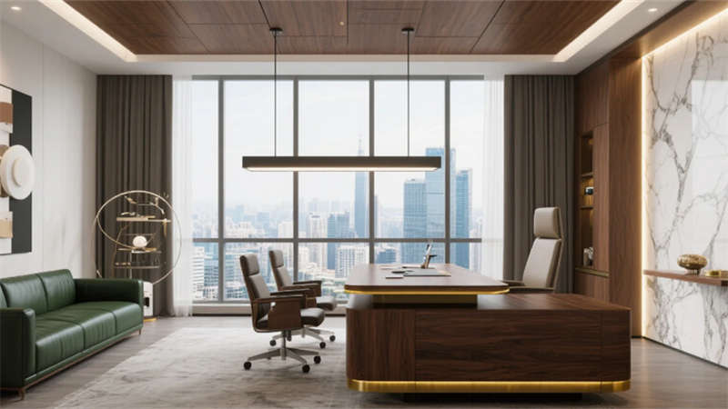 私密空間演繹克制的精致:經(jīng)理辦公室玻璃隔斷內(nèi),胡桃木書桌與毛氈吸音墻平衡理性與溫度;總裁套間則以大理石暗光墻面對(duì)話城市天際線,黃銅細(xì)節(jié)點(diǎn)亮低調(diào)的尊崇。會(huì)議室黑石長(zhǎng)桌與磁吸玻璃書寫面碰撞靈感,而公共休息區(qū)陶土花盆與橄欖綠軟墊,在混凝土中島上生長(zhǎng)出松弛的煙火氣。