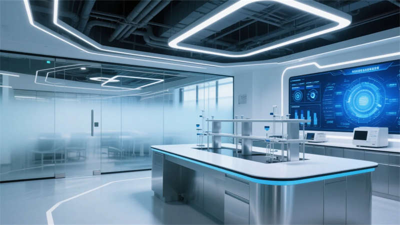 辦公空間呈現(xiàn)去中心化的未來(lái)圖景。模塊化工位可隨時(shí)重組為頭腦風(fēng)暴環(huán)島,聲學(xué)織物包裹的膠囊艙提供深度思考庇護(hù)所。最具革命性的是“實(shí)驗(yàn)室劇場(chǎng)”,研發(fā)設(shè)備的機(jī)械美學(xué)被提升為空間敘事的主角,集成于銀色島臺(tái)的精密儀器與頂部藝術(shù)化排布的管線系統(tǒng),構(gòu)成科技崇拜的現(xiàn)代祭壇。霧化玻璃墻在透明與隱私模式間瞬時(shí)切換,象征知識(shí)共享與知識(shí)產(chǎn)權(quán)保護(hù)的辯證統(tǒng)一。