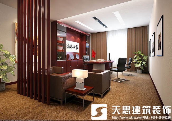 總經(jīng)理辦公室裝修總經(jīng)理掌管公司決斷力和精準(zhǔn)的判斷力是一個(gè)企業(yè)的領(lǐng)導(dǎo)核心,所以總經(jīng)理的辦公環(huán)境至關(guān)重要總經(jīng)理辦公室的位置最重要,它是企業(yè)成敗的關(guān)鍵,原則上宜在辦公室的后方,進(jìn)入總經(jīng)理辦公室的路線也應(yīng)順暢,從大門走到房間的路線也不可彎彎曲曲,經(jīng)理辦公室形狀不宜為“l”形,角多的辦公室也不宜,不易與員工、客戶協(xié)調(diào)溝通圓形辦公室也不適宜的,總經(jīng)理室裝修設(shè)計(jì)總經(jīng)理辦公室通常是由會(huì)管區(qū)和辦公區(qū)這兩個(gè)部分組成,公區(qū)由辦公桌、書柜、椅子、訪客椅等組成,客區(qū)配備有小型會(huì)議桌、部分沙發(fā)等辦公家具組成,間要反映經(jīng)理的一些個(gè)人愛好的品味,時(shí)也要反映一些企業(yè)文化特征。