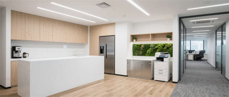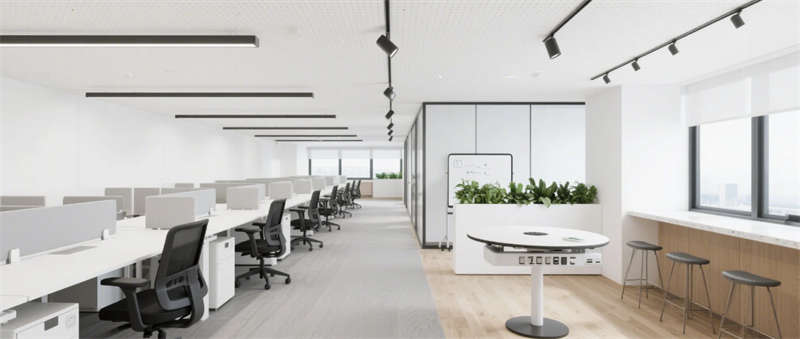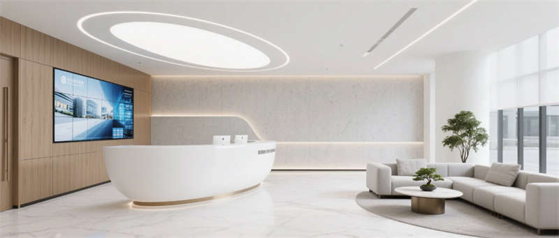 步入企業(yè)大堂,淺白大理石與溫潤(rùn)木紋墻面形成材質(zhì)對(duì)話(huà),懸浮式線(xiàn)性燈光如時(shí)空隧道貫穿空間。深藍(lán)色企業(yè)LOGO在弧形純白前臺(tái)形成視覺(jué)錨點(diǎn),數(shù)字影像墻實(shí)時(shí)跳動(dòng)的數(shù)據(jù)流與模塊化沙發(fā)區(qū)的綠植盆景構(gòu)成動(dòng)與靜的平衡。辦公區(qū)采用模塊化升降系統(tǒng),穿孔吸音天花與協(xié)作島構(gòu)成靈活辦公矩陣,落地窗邊的高吧臺(tái)休憩區(qū)借綠植隔斷營(yíng)造都市綠洲意境。