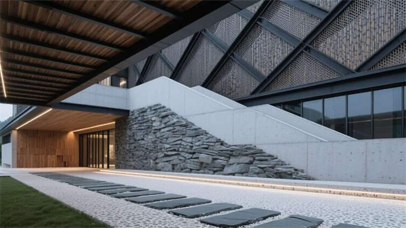 建筑外觀以滁州竹海為靈感,斜交網(wǎng)格結(jié)構(gòu)勾勒出山勢輪廓,穿孔鋁板在光影間呼吸。懸浮橡木雨棚如云中棧橋,將自然意象引入現(xiàn)代語境。青石板基座延伸至室內(nèi),形成連貫的在地敘事。