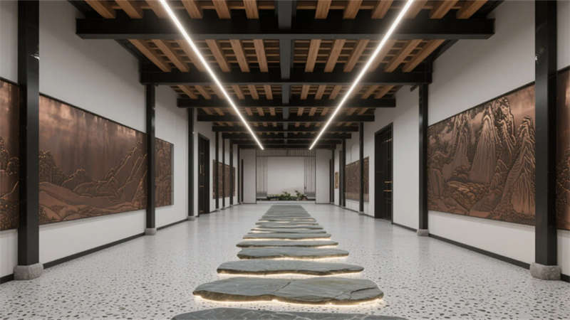 前臺大廳成為文化凝練的序章:層疊銅藝山形墻在光暈中起伏,夯土臺面與懸浮木構(gòu)的碰撞隱喻傳統(tǒng)與未來的對話。紙膜藝術(shù)燈如空中浮云,柔化工業(yè)風的冷峻基調(diào)。