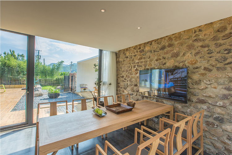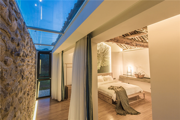 “隨著越來越快的生活節(jié)奏我們每天奔忙,每天遺忘城市越來越近,鄉(xiāng)村卻越來越遠”。這所名為“畫框里”的民宿位于水泉子村,而名字寓意為將百里畫廊的山水美景留在畫中院中??煽吹矫逼鋵嶌`動的山水畫這四季的變幻,凝集了我們對生活所有的向往。落地窗邊放置了浴缸做一個泡泡浴一眼望去是院落的美景和遠山的意境。主臥空間很寬敞,新中式的原木配灰色的簡易家具些許的現(xiàn)代元素金屬攝影燈使房間內多一份輕松感。