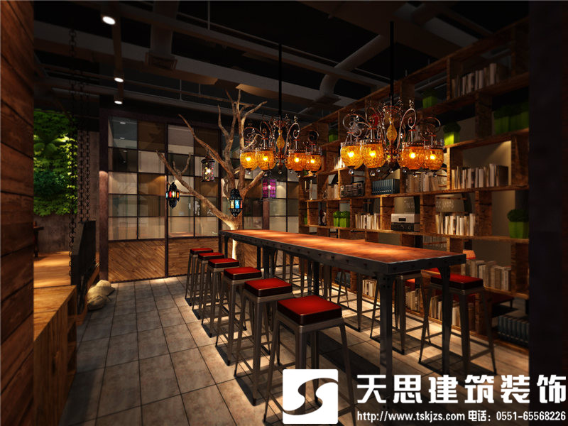 入門處,觸手可及,參差不一的木質(zhì)裝飾成就了獨(dú)特的流動感,莞爾一笑就可見擺放一隅的書架。