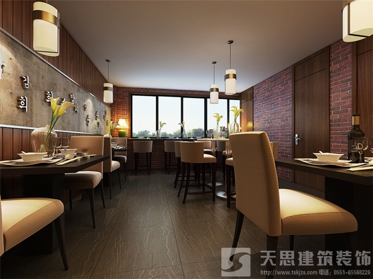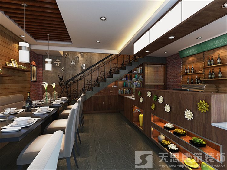 韓國紫菜包飯屬于一家連鎖店,在合肥目前有接近10家分店,在裝修風(fēng)格上結(jié)合了地域文化特點(diǎn),韓國人的居住空間比較狹小,對(duì)空間的利用非常緊湊。席地而坐的生活習(xí)慣讓他們呈現(xiàn)出一種低姿態(tài)的,貼近自然的生活形態(tài),居室的設(shè)計(jì)所呈現(xiàn)出來的是小家碧玉式的精致,沒有奢華和張揚(yáng)??臻g裝飾多采用簡(jiǎn)潔、硬朗的直線條 ,反映出現(xiàn)代人追求簡(jiǎn)單生活的居住要求,迎合了韓式家居追求內(nèi)斂、質(zhì)樸的設(shè)計(jì)風(fēng)格。