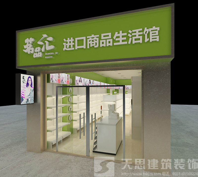 項(xiàng)目名稱:茗品匯進(jìn)口商品生活館 設(shè)計(jì)師:汪袁 面積:40平米 項(xiàng)目地址:包河區(qū)海關(guān)路 設(shè)計(jì)簡介:進(jìn)口商品生活館門頭刷上清新的綠色乳膠漆,鑲嵌白色發(fā)光體