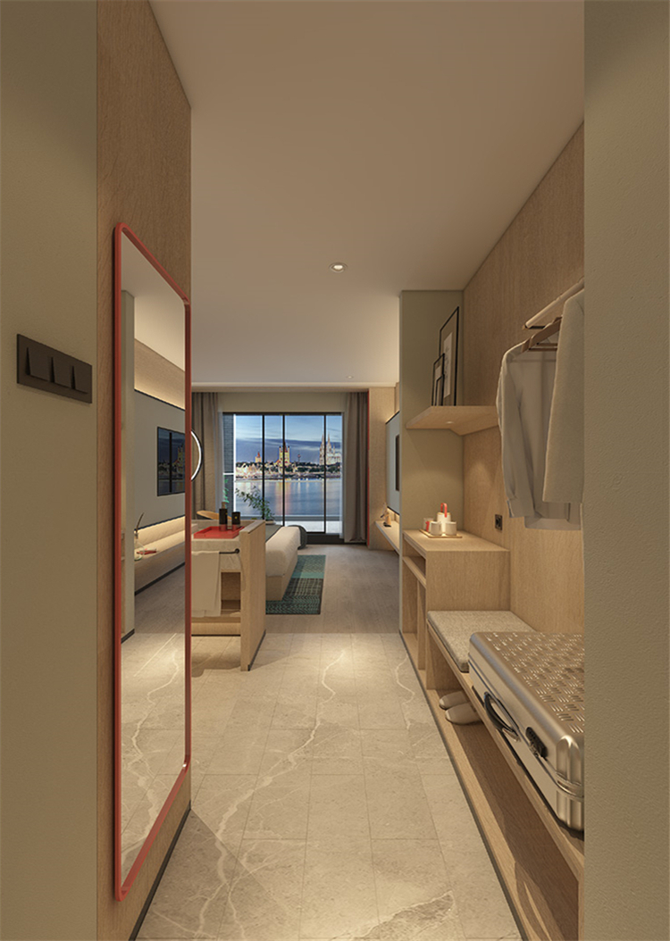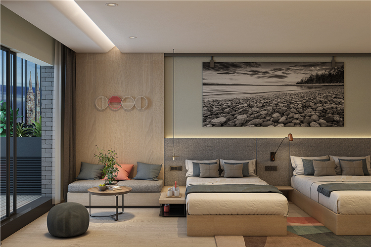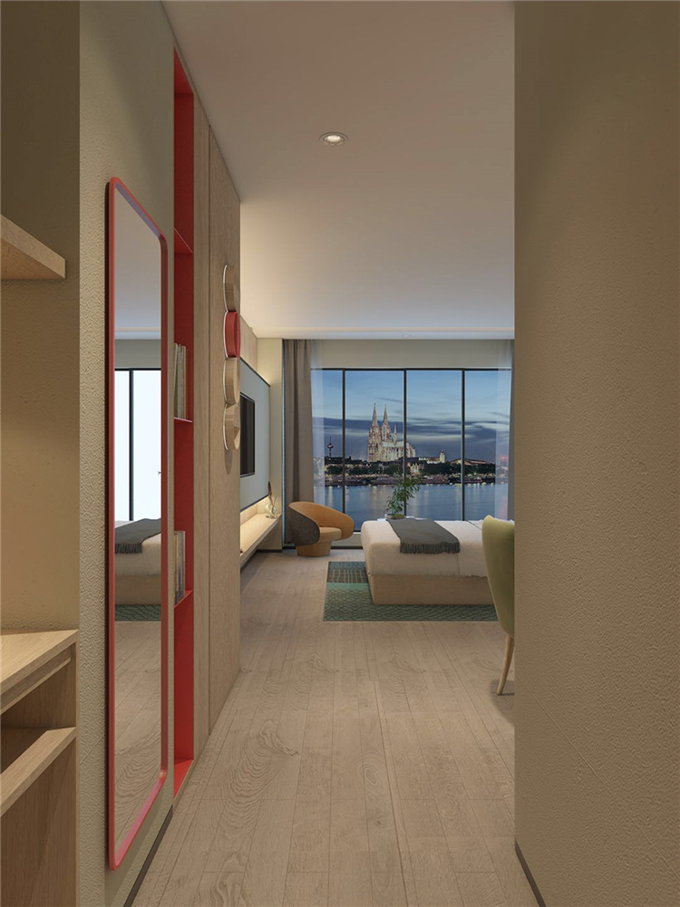 在功能的安排上人性化,為顧客帶來舒適的入住體驗與外立面相呼應,設(shè)計師在完整的用材體系上,增加了對比性明顯的色塊,高度提升了空間的趣味性和耐看度。