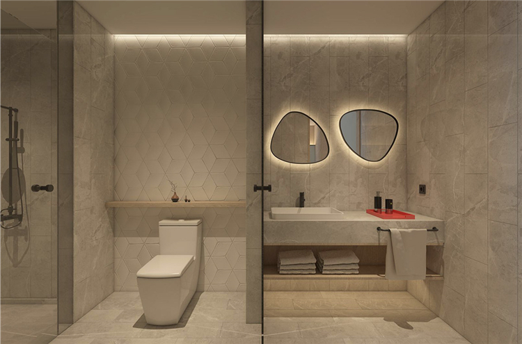 設(shè)計師遵循原有的管道設(shè)計,通過半堵實用的功能墻,將洗浴間和馬桶間劃分,在隱形了五金件和儲物歸納后,化繁為簡被得到了充分的運用,就連回風口也被巧妙的融入在燈帶里.