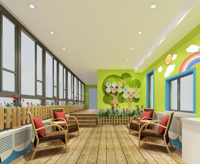 休息區(qū)域的設(shè)計:此處不僅可供教師休息,同時也可供孩子們在這里玩耍、娛樂,設(shè)計師的目的就是想讓大家在這里可以感受到陽光的溫暖,在此處陽光滲透到每一處空間,設(shè)計師希望陽光、自然可以掃清教師心中的煩躁,同時也給孩子更多的溫暖。