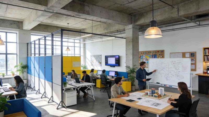 生產(chǎn)區(qū)域按需分區(qū):十萬級潔凈電子車間以灰白為主調(diào),配備自動化流水線與防靜電系統(tǒng);重型設(shè)備組裝車間采用耐磨地坪與行車軌道,色彩對比鮮明。辦公區(qū)域兼顧協(xié)作與專注,開放式卡位、創(chuàng)意辦公區(qū)與研發(fā)專注艙合理布局,裸頂工藝、原木元素與綠植點綴,平衡工業(yè)感與舒適度。
