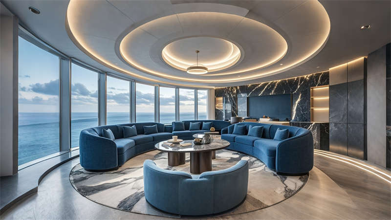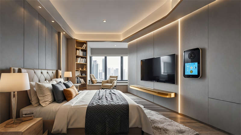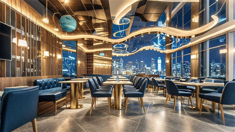 色彩體系以香檳金與深海藍為主調(diào),大堂采用香檳金金屬線條勾勒建筑肌理,搭配深海藍大理石營造視覺重心。客房區(qū)運用暖灰硬包墻面平衡色彩強度,通過2700K暖光與4000K中性光分區(qū)照明塑造晝夜場景。材質(zhì)組合注重層次:大理石地面、金屬構(gòu)件、絨布軟包形成質(zhì)感三部曲。