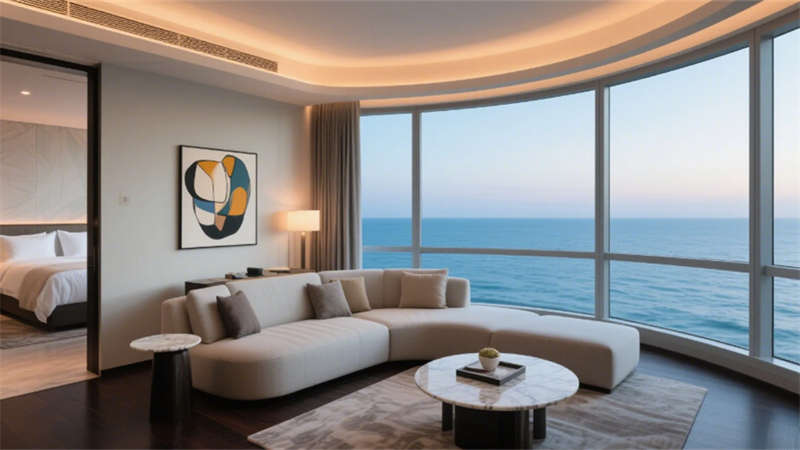 客房區(qū)域強調(diào)“靜謐中的科技感”,標準間通過木飾面隱藏燈帶與霧化玻璃衛(wèi)浴實現(xiàn)功能與美學的平衡;全景套房則以180度落地窗引入自然景觀,臨窗圓形浴缸與雙臺盆設計重新定義奢華體驗。