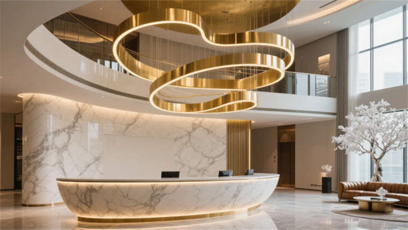 外觀設計以玻璃幕墻與天然石材的幾何拼接為視覺焦點,日景通過景觀水池倒映建筑輪廓,夜晚則依托泛光照明凸顯立體層次,與城市天際線和諧共生。挑空兩層的大堂以金色流線吊燈與懸浮水晶樹藝術裝置為核心,大理石地面與弧形LED背光接待臺營造沉浸式抵達體驗,自然光與暖色燈光交織,傳遞低調(diào)奢華氣質(zhì)。