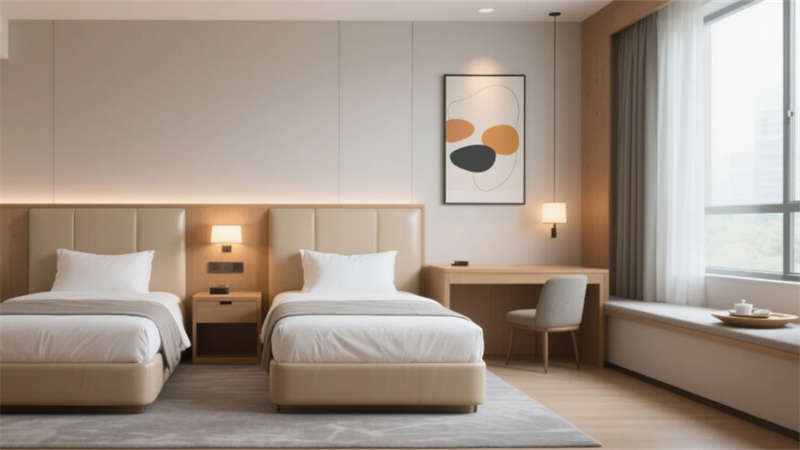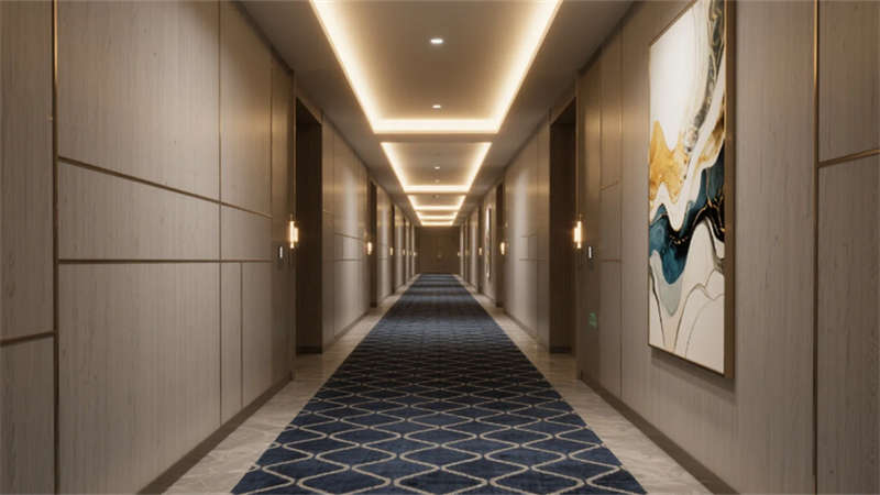 客房設(shè)計(jì)聚焦人性化體驗(yàn):大床房以深藍(lán)色絲絨床頭與城市夜景形成戲劇性對比,透明玻璃隔斷的圓形浴缸賦予空間通透感;雙床房通過原木色書桌、飄窗茶臺與抽象掛畫,平衡商務(wù)與居家需求。走廊則運(yùn)用深藍(lán)色幾何地毯與隱藏式燈帶,引導(dǎo)視線至盡頭的藝術(shù)畫作,靜謐中暗藏張力。