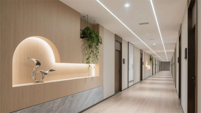 酒店以現(xiàn)代簡(jiǎn)約美學(xué)貫穿始終,走廊作為串聯(lián)各區(qū)域的紐帶,延續(xù)了整體的設(shè)計(jì)語(yǔ)言?;⌒伪邶惻c懸浮天花板的線性燈光,柔和地引導(dǎo)動(dòng)線,淺木飾面與石材的碰撞在低調(diào)中彰顯質(zhì)感。壁龕內(nèi)的藝術(shù)擺件與垂墜綠植,將自然氣息融入過(guò)渡空間,打破傳統(tǒng)走廊的單調(diào)感。