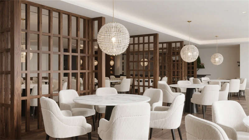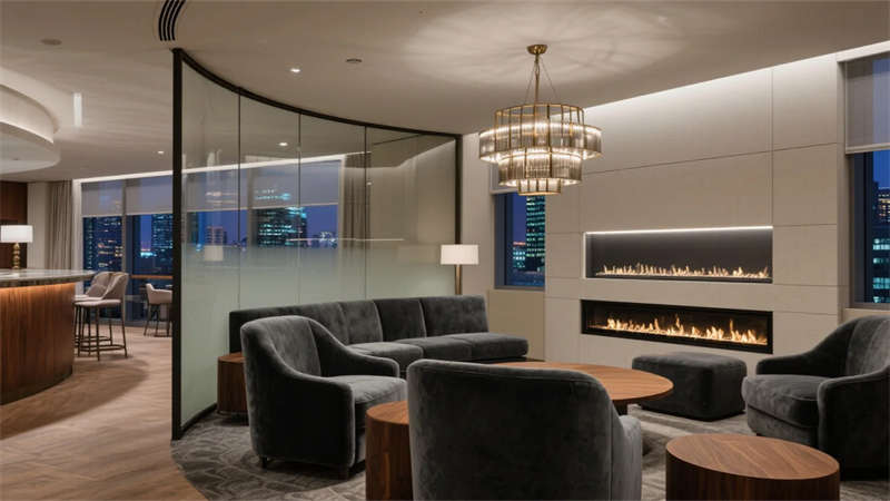 公共空間注重功能與美學(xué)的平衡。行政酒廊通過(guò)弧形玻璃劃分動(dòng)靜區(qū)域,嵌入式壁爐跳動(dòng)的火焰軟化商務(wù)空間的冷峻感;多功能會(huì)議室采用可變形家具系統(tǒng),胡桃木飾面墻與線(xiàn)性燈光共同構(gòu)建專(zhuān)注場(chǎng)域;全日餐廳以開(kāi)放式廚房為舞臺(tái),球形吊燈在巖板餐桌上投下溫暖光暈,激發(fā)商務(wù)社交的愉悅可能。