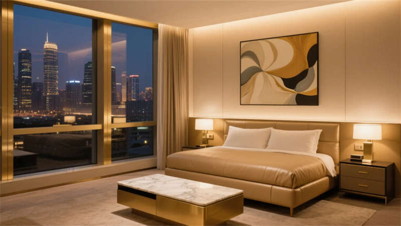 酒店以當(dāng)代輕奢美學(xué)為靈魂,將精致質(zhì)感融入每個空間肌理。淺金色金屬與溫潤大理石的碰撞,勾勒出低調(diào)奢華的氣質(zhì)基底,暖灰中性色調(diào)營造舒緩靜謐的氛圍場域。落地玻璃幕墻引自然入室,琥珀色玻璃屏風(fēng)與鎏金藝術(shù)裝置在光影交織中煥發(fā)靈動生機。