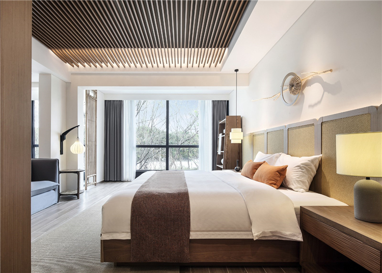 客房布草裝飾選用棉麻材質(zhì),色彩過渡柔和,給人暖意。床頭的實(shí)木雕畫回歸原野古樸,竹編吊燈造型各異,一花一草一木皆入景,簡而裁,巧而自然。竹藏風(fēng)雨,觸及野趣,山居生活隱逸悠然,靜念生長。
