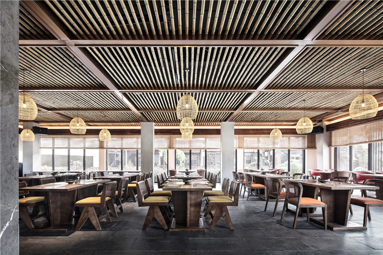 入口處,取自田間的南瓜瓜藤被巧妙用作空間中的藝術(shù)裝置,演繹田園之樂。整個空間輔以大量的竹木,意蘊(yùn)古樸,光影變化中,增添了清新和雅氣息。