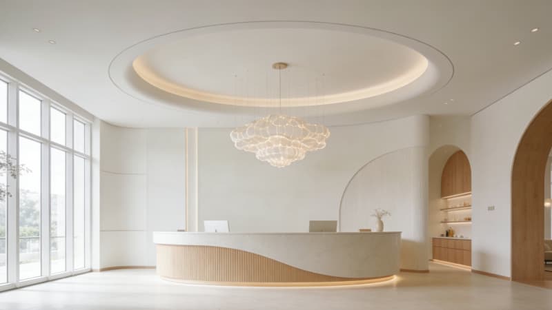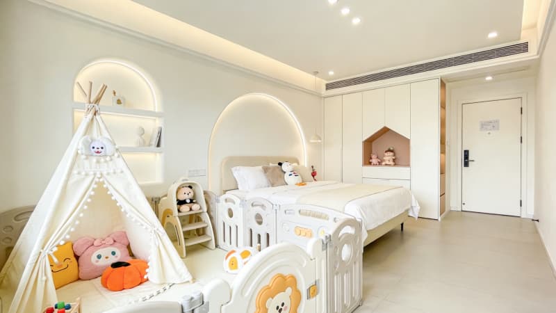 室內公區(qū)包含弧形前臺大廳、咖啡書吧、簡約餐廳等功能空間,動線流暢、采光充足,兼具實用性與打卡屬性??头亢w大床房、雙床房、溫馨親子房,統(tǒng)一奶油色系與懸浮床、飄窗等細節(jié),舒適耐看。衛(wèi)生間干濕分離、走廊極簡感應燈光,兼顧品質與體驗。