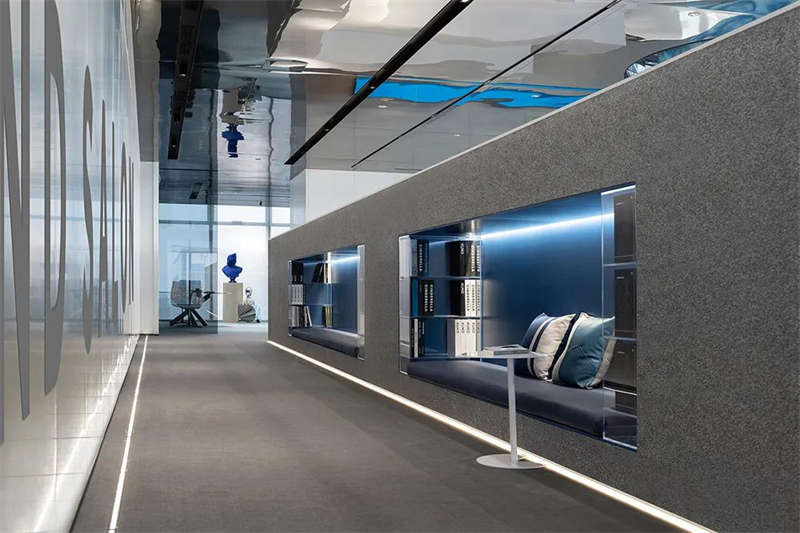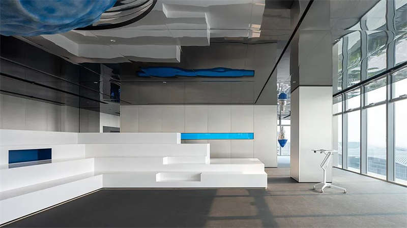設(shè)計師在灰調(diào)的空間中,注入純凈的克萊因藍(lán),高飽和度的單純色彩具有神奇的魔力,讓人們在強烈的視覺沖擊下迷失感官,與室外的海天融通一體,達(dá)致沒有感官桎梏的心靈自由;灰色則讓空間保有充裕的從容,以及留白的呼吸感。以此實踐在物質(zhì)之上,具有純粹精神的空間情景。