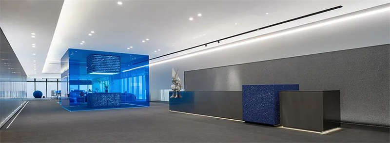 室內(nèi)空間由功能家具和裝置形成自然分隔,空間整體因祛除隔斷而產(chǎn)生了流動,這與科學(xué)巨匠斯蒂芬·霍金的宇宙觀具有一種相通性。太空兔和隕石一起來到這里,被安置在接待臺和會議室中,向來訪的人們講述宇宙的故事,猶如那些激動人心的創(chuàng)業(yè)事跡一樣,源于有限的奇點,產(chǎn)生突破界限的無窮能量。