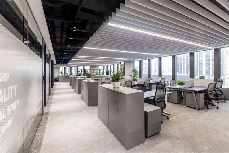 前臺區(qū)的兩條燈帶從吊頂延伸至側(cè)墻體底部,光源自上而下具有連貫性。培訓(xùn)室縱橫燈帶分割出的塊狀吊頂間,在施工時做了整齊對接的處理,以此增加空間的秩序感。齊整化的處理,凸顯出辦公空間嚴(yán)格的秩序性。