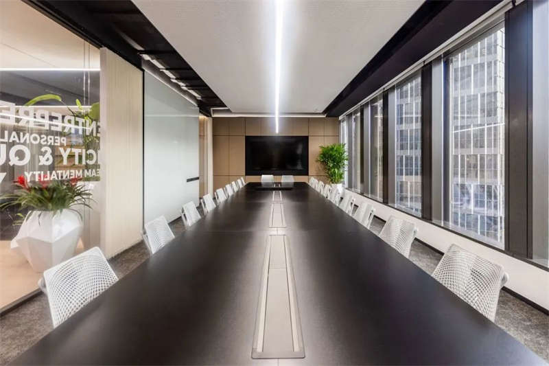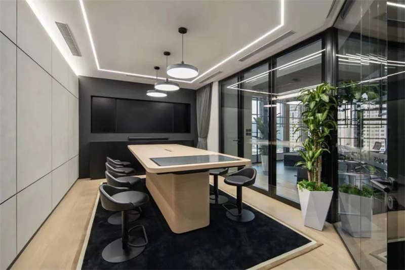 所有的會議室中,電視屏背景墻均以縱橫相交的豎條黑色U形槽做了分塊處理,在電視屏幕安裝位置上保持了統(tǒng)一原則,電視屏垂直居中,上下線條與背景墻上部、底部的距離相等。諸如此類的設(shè)計,使得辦公空間視覺條理性得到了加強(qiáng)。
