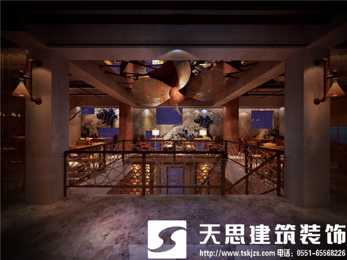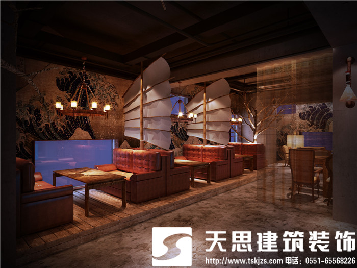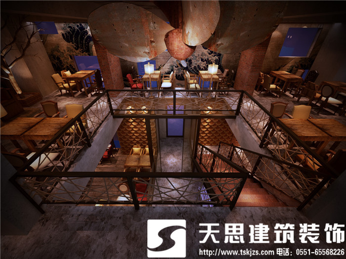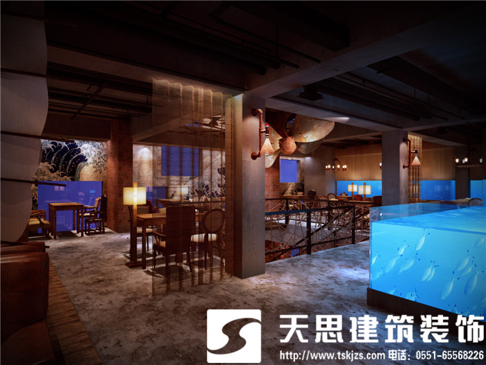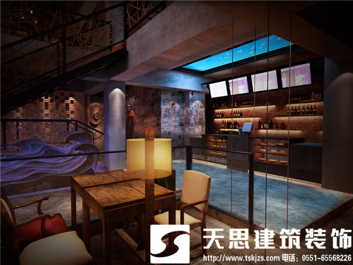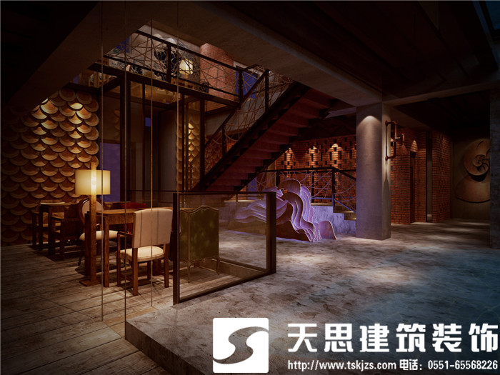 設(shè)計(jì)師讓空間呈現(xiàn)對話關(guān)系,彼此呼應(yīng)。二層的長方形水族魚箱,在一樓即為吧臺頂層的雅致裝飾,自然傾瀉的燈光給吧臺區(qū)足夠的光源,簡約環(huán)保的理念貫穿在空間設(shè)計(jì)里。節(jié)次鱗比的魚鱗造型墻飾,富有藝術(shù)感,特用原木制作,將韻味進(jìn)一步升華。