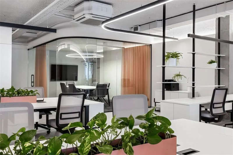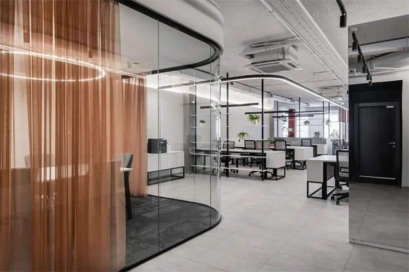 淺灰色的頂面與地面,配以白色墻體和主體辦公家具,再輔以縝密的燈光照明,讓室內(nèi)呈現(xiàn)明亮純凈的光彩質(zhì)感;黑色線性元素的加入豐富了空間構(gòu)成和視覺趣味性;唯一的暖棕色彩的點(diǎn)綴讓空間更靈動(dòng)更富有層次感,也為純凈極簡(jiǎn)的空間帶去一抹溫暖氣息。