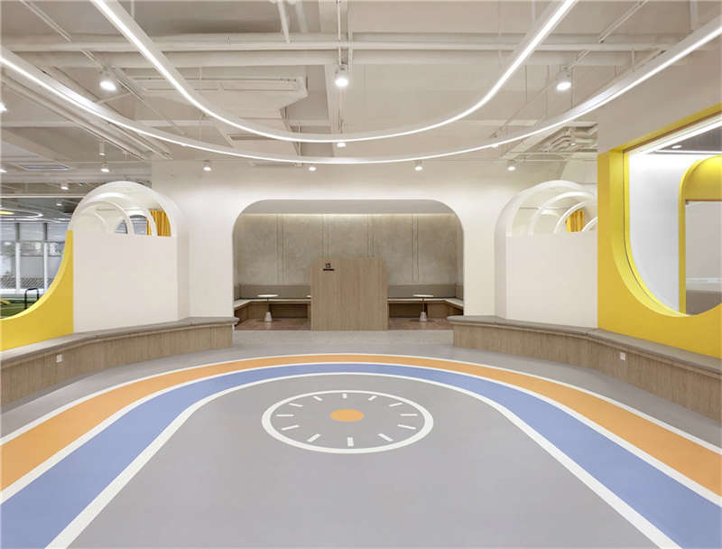 陽(yáng)光洗禮這片綠茵,賦予茁壯的祝福。空間抹去一堵墻體,消弭了教室的結(jié)構(gòu),其功能得到了重塑,給組合課堂提供支持。地面的跑道被星球的神奇能量映射在空中,下一秒的跳躍,也許能乘駕著時(shí)間,奔跑向星辰和大海。每一個(gè)教室的教具都被用心安放,留給孩子們足夠的空間揮灑自由。柱間尺度的限制下我們轉(zhuǎn)換了家長(zhǎng)的看課方式,親子間共同的成長(zhǎng)是我們對(duì)場(chǎng)所的思考。