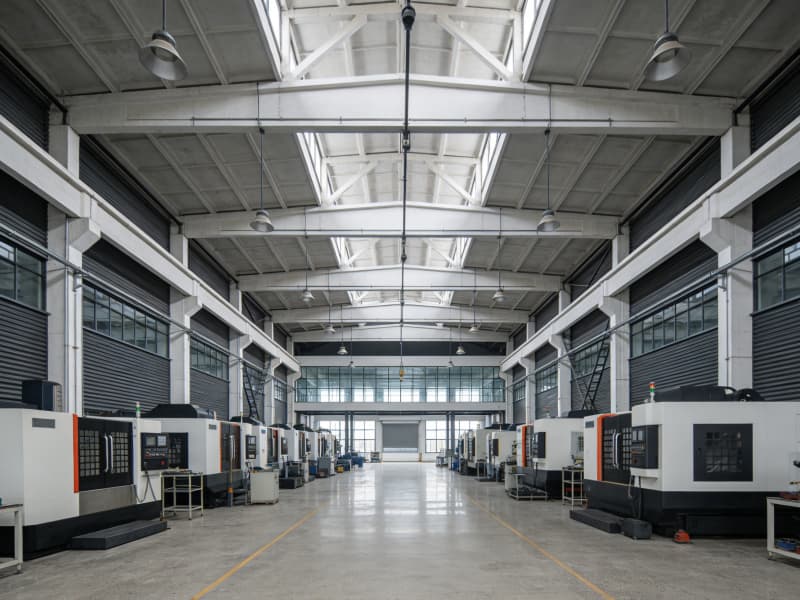進入廠房內(nèi)部,生產(chǎn)區(qū)域挑高設(shè)計,空間開闊,頂部的桁架結(jié)構(gòu)裸露在外,搭配軌道式吊燈,營造出強烈的工業(yè)氛圍。地面選用耐磨的金剛砂地坪,承載能力強且便于清潔,滿足高強度生產(chǎn)需求。