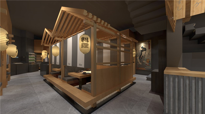 整體設(shè)計(jì)風(fēng)格上以日式精致私密性為主,每個(gè)餐臺都有獨(dú)立的隔斷進(jìn)行分割,這樣在整個(gè)空間中就會形成錯(cuò)落有致的空間布局,不僅美觀而且空間利用率高,同時(shí)保障了顧客就餐的私密性。