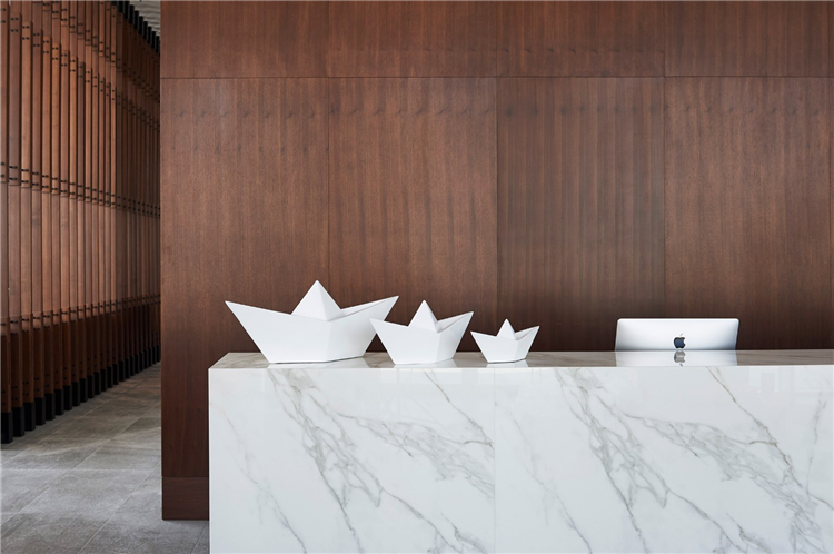 大堂和餐廳的內(nèi)部特色是光滑的白色石膏墻壁、大理石、黃銅和深色的木材家具。這里用了一個白色,純凈,簡單的立面,走進(jìn)里面,仍然會感覺到白色,但同時我們使用了一些其他的材料。所有的顏色都來自真實(shí)的材料,讓你進(jìn)入室內(nèi)時更溫暖。